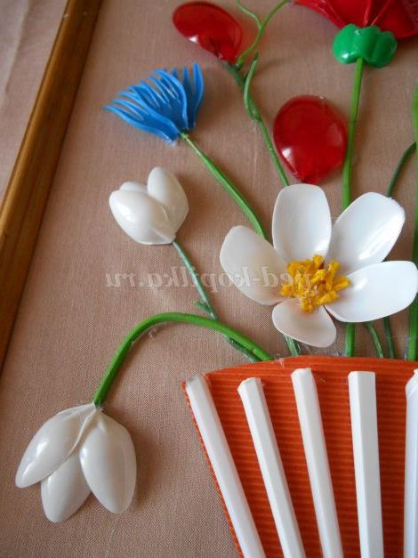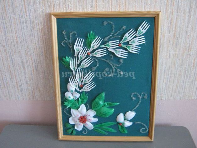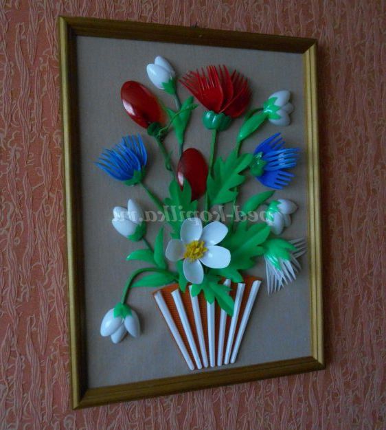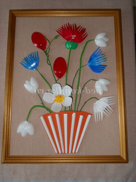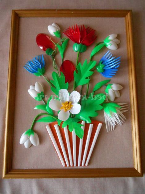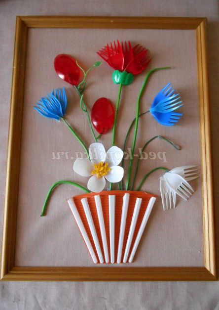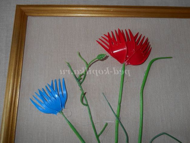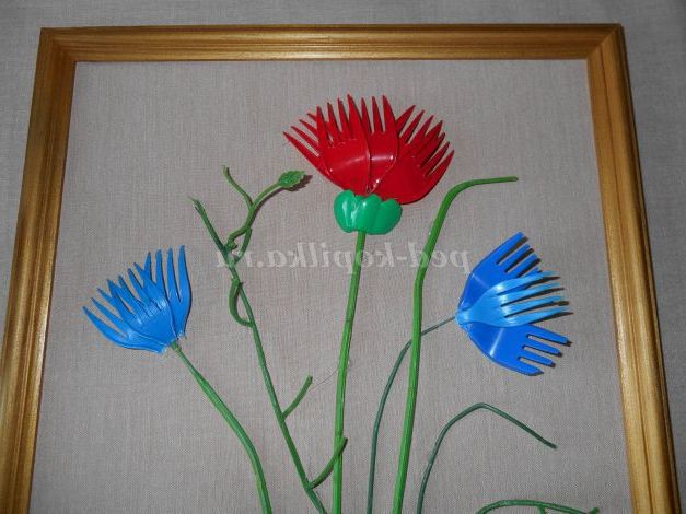 Опис роботи. Майстер - клас розрахований для дітей шкільного віку, педагогів, батьків. Виріб виконується з пластикових ложок, виделок, кольорових пляшок. Процес виготовлення квітів для картини не складний, але вимагає терпіння і акуратності. Виготовлення картини доставить дорослим і дітям велике задоволення.