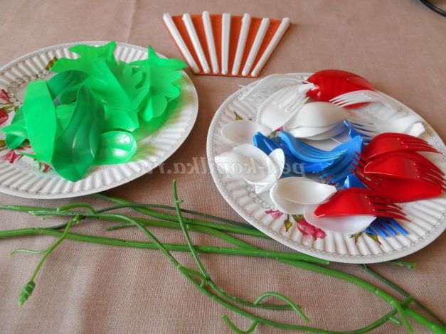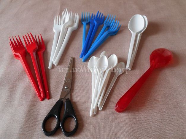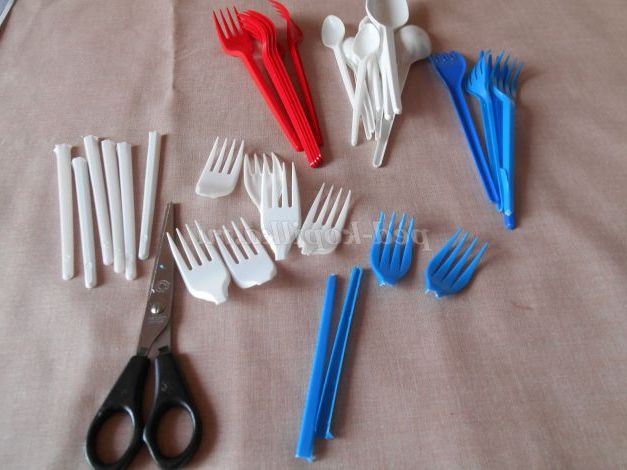 Почнемо роботу з виготовлення квітів. Нам знадобляться вилки: 5 червоних, 7 синіх і 4 білих. Білі ложки різних розмірів - 19 штук і 2 червоні ложки. Кількість буде залежати від того, скільки ви зробите квітів і якої форми. Якщо кольорових не знайдеться, не впадайте у відчай. Їх можна пофарбувати або замінити на інші. Зробити, наприклад, квіти з пластикових пляшок.