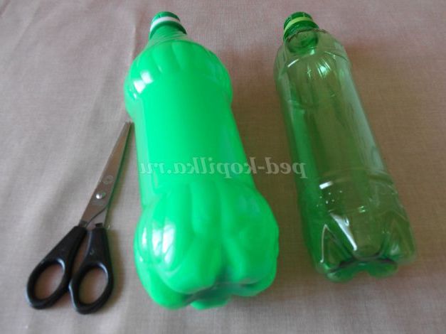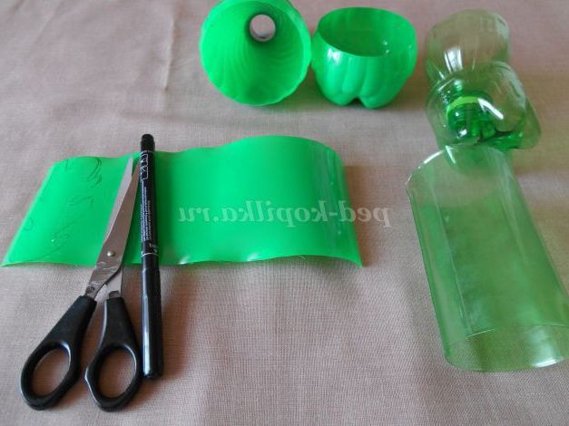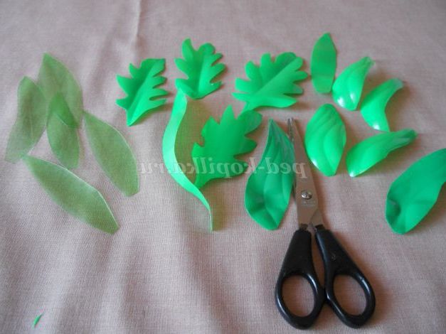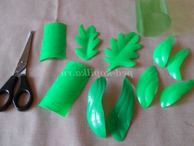 З зелених пляшок робимо листя. Розрізаємо пляшки. Фломастером малюємо листя різних розмірів і химерної форми. Дрібні листочки можна вирізати відразу, не прорисовуючи їх.