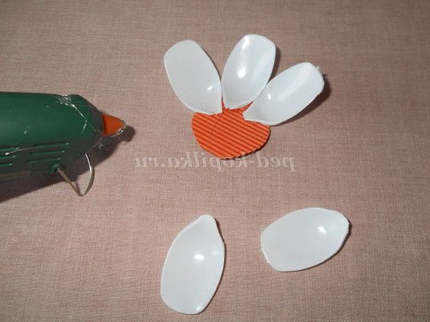 Серединка пустовата. Спробуємо зробити з десертних білих ложок розпустилася анемон. Вирізаємо гурток з картону, по колу приклеюємо ложки.
