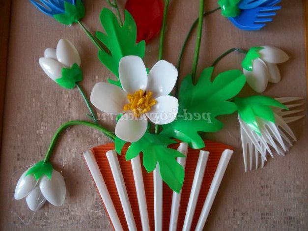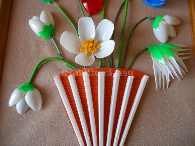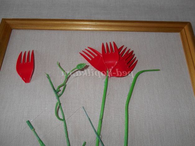 З 4 вилок зробимо білу гвоздику і на гілочку приклеїмо червоні ложки - тюльпани. Я так думаю.