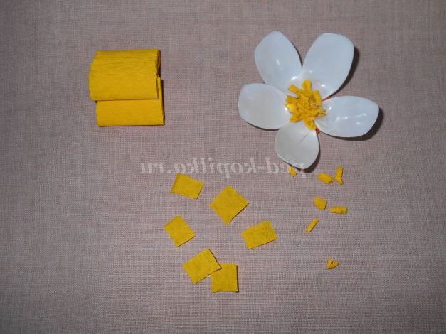 Беремо жовту гофрований папір, нарізаємо шматочками, закручуємо їх в джгутики і приклеюємо в середину квітки.