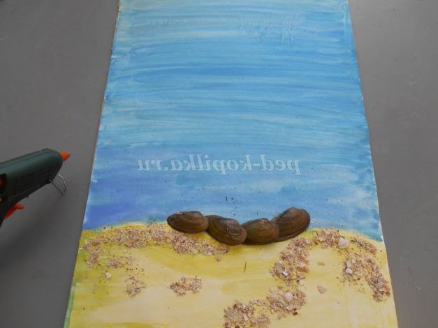 Приклеюємо на жовтий фон (морський берег) подрібнені черепашки, пісок, камінці. З черепашок молюсків «будуємо» судно.