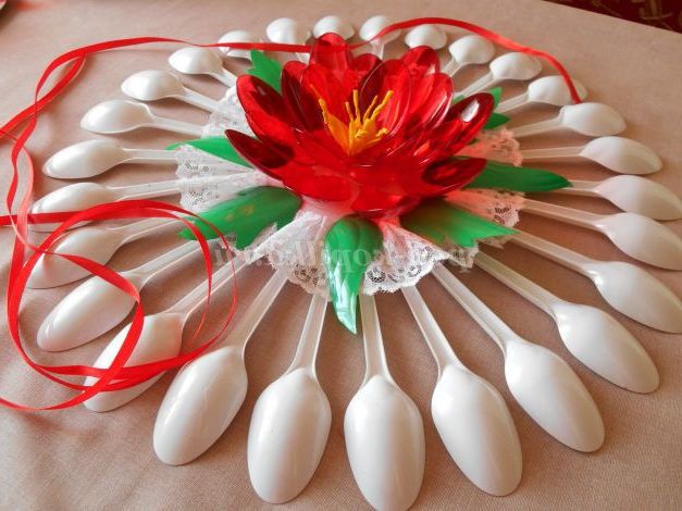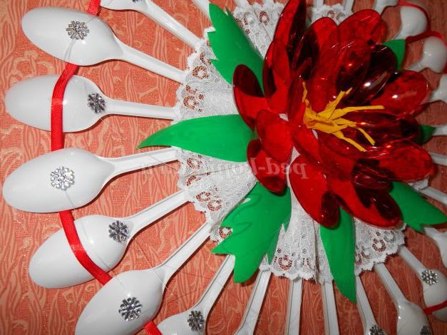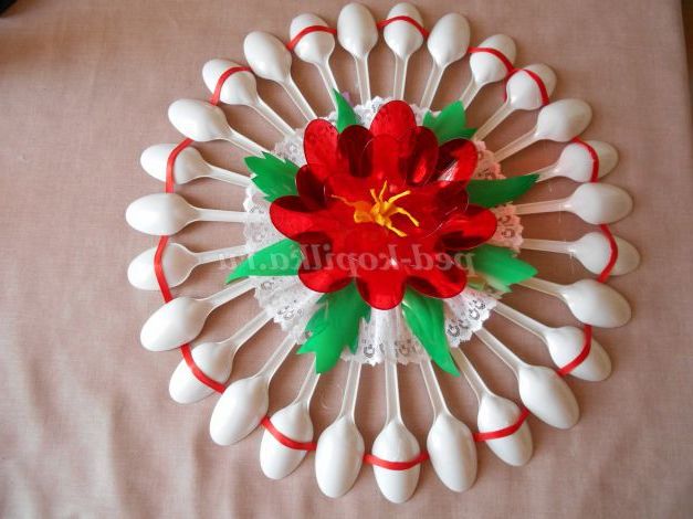 Декор - приємний і красивий атрибут нашого будинку, робочого місця. Особливо він приємний, якщо це зроблено своїми руками. Зараз існує маса ідей і величезний простір для польоту нашої фантазії. Наприклад, панно з пластикових ложок. Здавалося б, матеріал одноразового використання і куди його можна ще застосувати, крім прямого призначення. Та не тут - то було. Ось вам і чергова ідея декору! Панно з білих пластикових ложок і червоненька квіточка в середині.