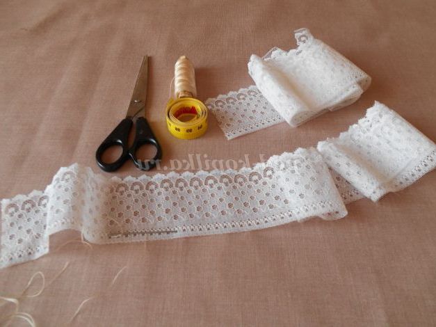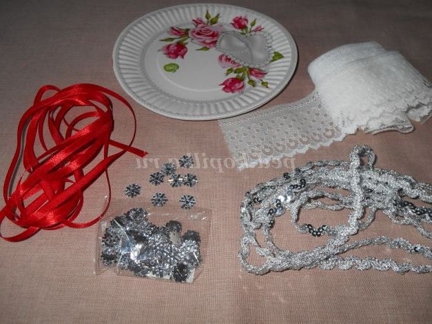 Будемо готувати предмети декору. Візьмемо біле шиття - 1м. Ви можете використовувати атласну стрічку, мережива. Все, що опиниться під рукою. По краю мережива прошиваємо пунктирним швом, робимо збірку. З'єднуємо мереживо в кільце за розміром тарілки.