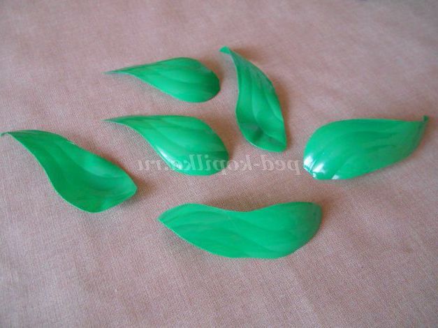 Приступаємо до виготовлення листя. Від зеленої пластикової пляшки відрізаємо верхню і нижню частину. На рівній поверхні малюємо фломастером листочки і вирізаємо.