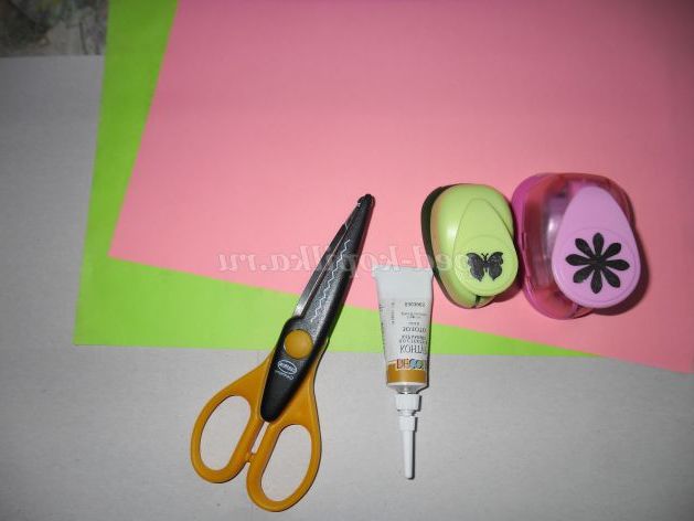 Обладнання: кольоровий папір, клей ПВА, фігурний дирокол «Метелики », фігурний дирокол " Квітка ",рифлені ножиці, вітражний контур.