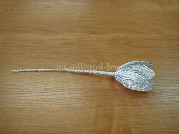 Збірка квітки: складаємо пелюсточки разом, беремо дротик і обвиває все хвостики поступово опускаючись вниз, таким чином формуючи стовбур.