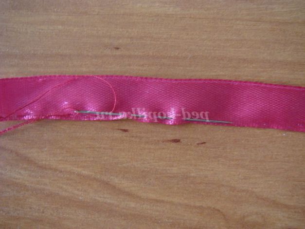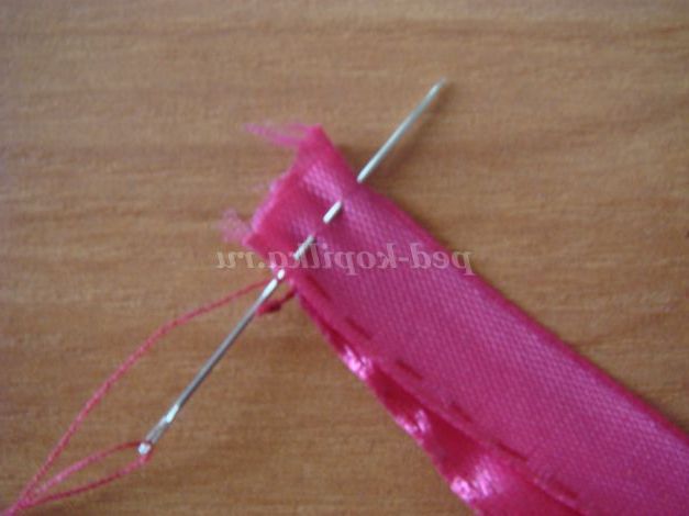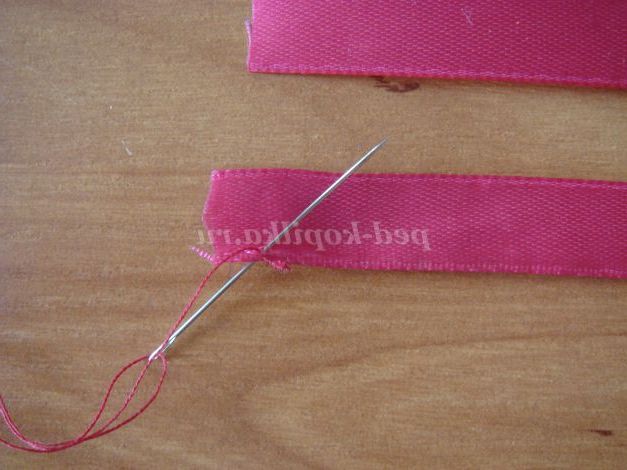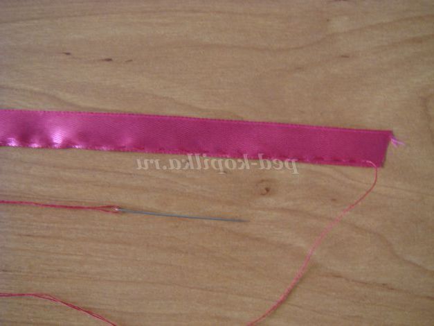 Втягає нитку в голку, зав'язуємо вузлик і закріплюємо на краю стрічки.
