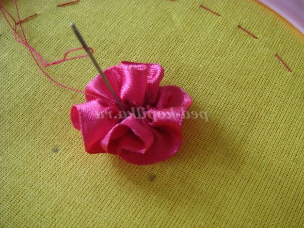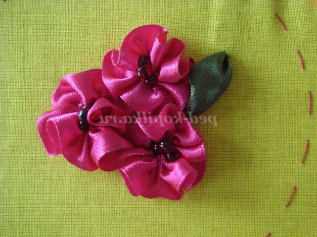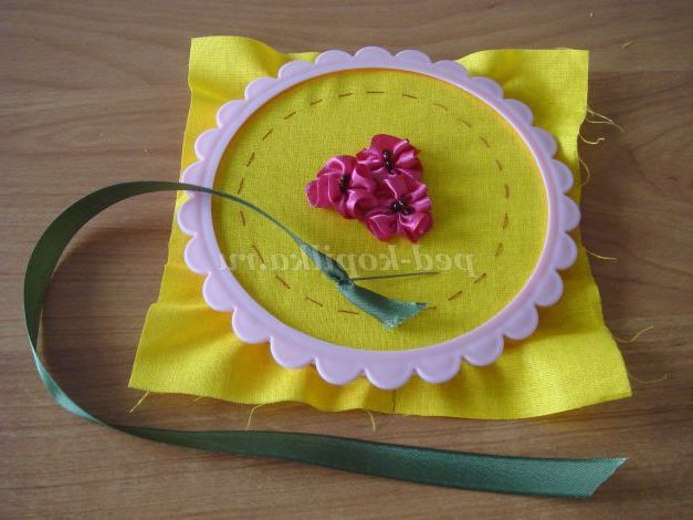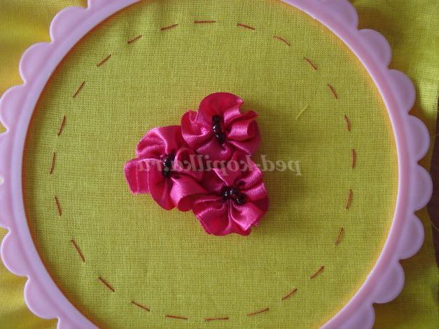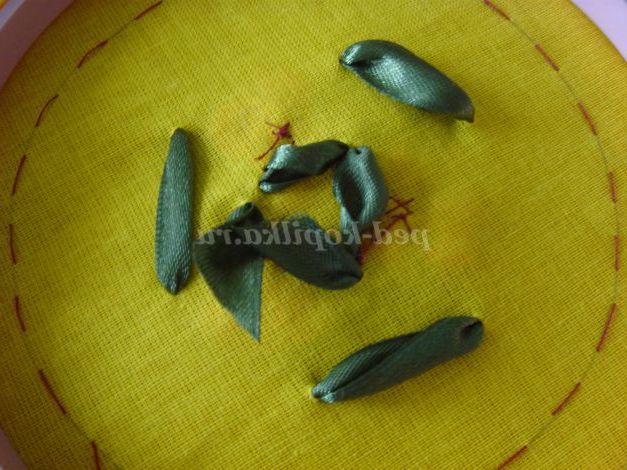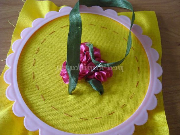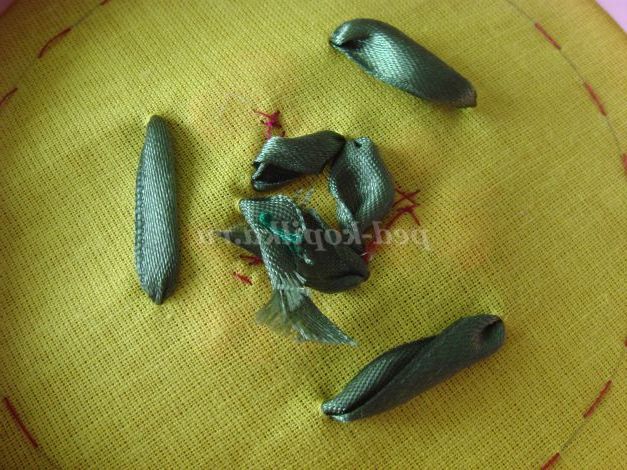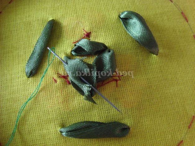 Робимо прокол голкою з виворітного боку, між квіточками і витягуємо голку зі стрічкою на лицьову сторону, залишаючи на вивороті «хвостик» 1 див.