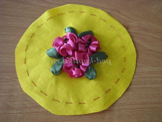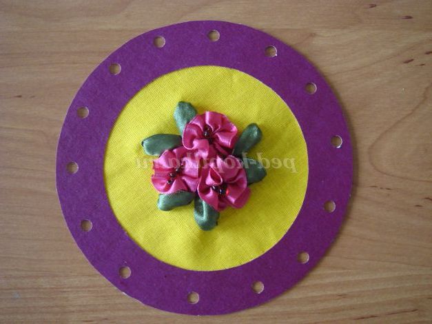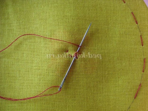 Прикладаємо квітка до середини тканини, проколюємо середину квітки і витягуємо голку на виворітну сторону.