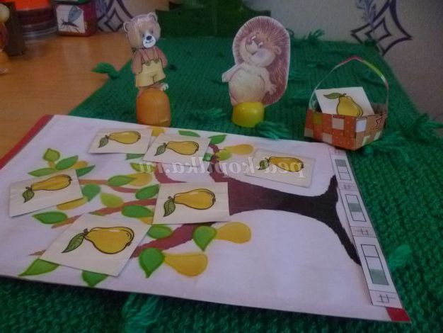 Логопед. Мишко далі крокує, а білка йому дорогу підказує. І зустріли вони на шляху їжачка. Просять його про допомогу, їжачок може їм допомогти, але зараз він зайнятий прибиранням груш. Давай йому теж мерщій допоможемо. Порахуй, скільки груш вже достигло: одна груша, і т.д. (дитина вважає і з дерева грушу опускає вниз)
