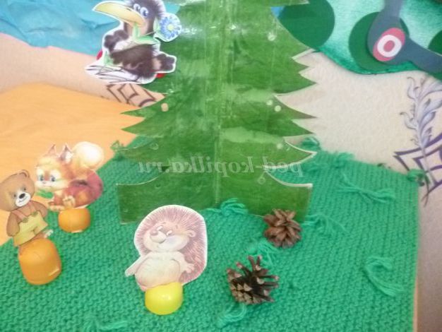 Логопед. На лісовій галявині жабенята влаштували концерт, і вони запросили наших героїв. Посади їх так: ведмежа - на самий широкий пеньок, їжачка - на найвищий пеньок, а білку - між ними.