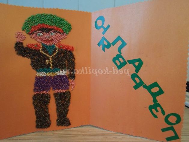 - виготовити листівку, використовуючи аплікацію з кольорового пшона;