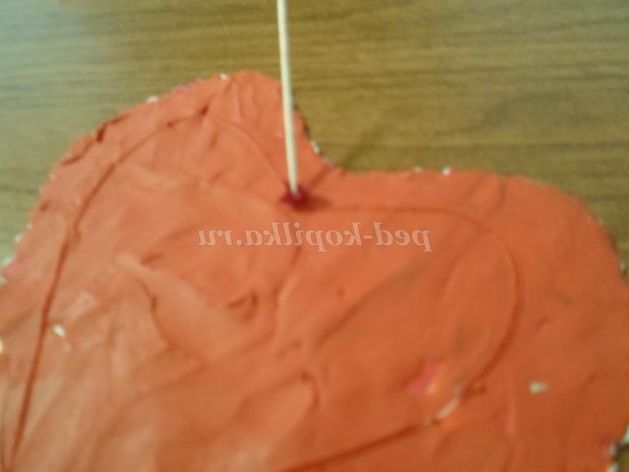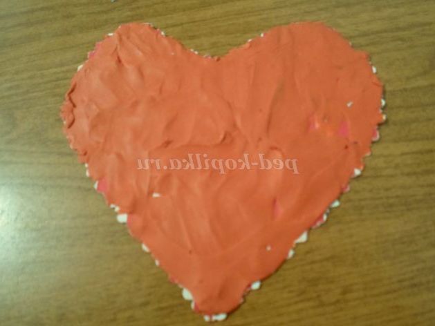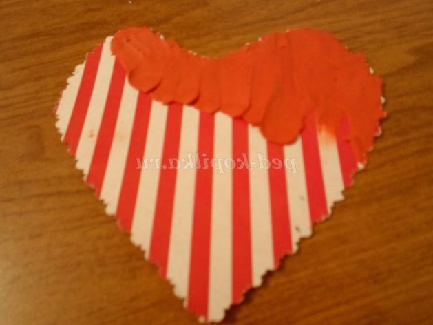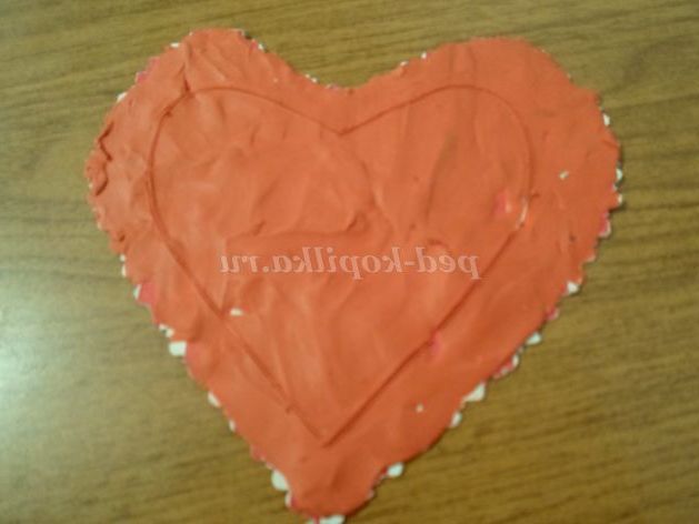 Беремо шаблон № 2, маємо його в центрі великого серця і обводимо зубочисткою. У нас виходить серце в сердце.Первым починаємо заповнювати менше сердечко.Ставим торцовочку на квадратик, як показано на фото. Сминаем серветку навколо торцювання, ущільнюючи знизу. Вставляємо нашу торцовочку в пластилін, придавлюємо і прибираємо торцювання. Таким чином, заповнюємо всю поверхню, щоб не було щілин.