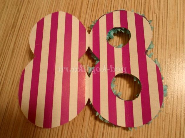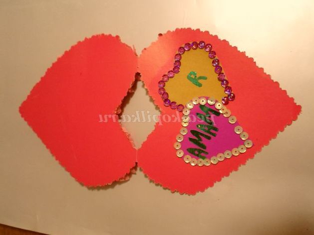Потім відкриваємо листівку і оформляємо її всередині. Оформити її можна як завгодно. Я вирішила так: обвела шаблон № 3 на два різних за кольором листків картону, вирізала їх, наклеїла, прикрасила паєтками. Можна додати напис із самоклеючої плівки.