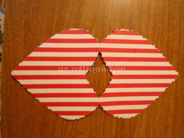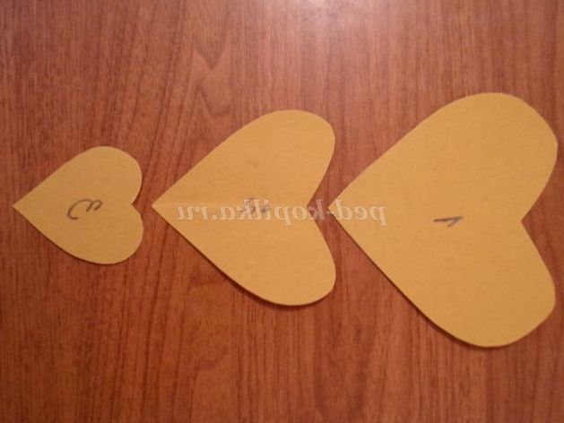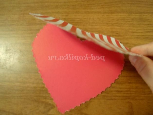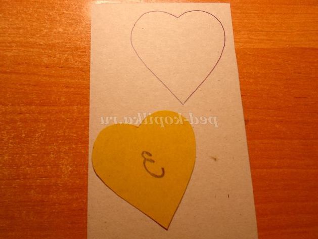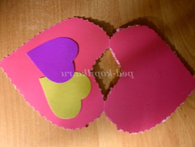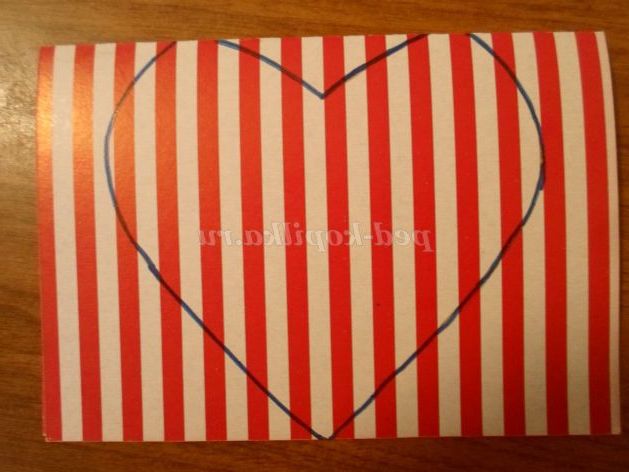 Потім складіть листок двостороннього картону навпіл, обведіть шаблон № 1 так, щоб при вирізанні верхня частина по лінії згину залишилася недоторканою. Вирізаємо сердечко. Я використовувала фігурні ножиці.