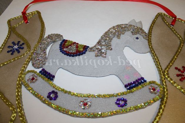 Зворотною стороною фломастера пробиває отвори для підвіски, зав'язуємо стрічку. Іграшка готова.