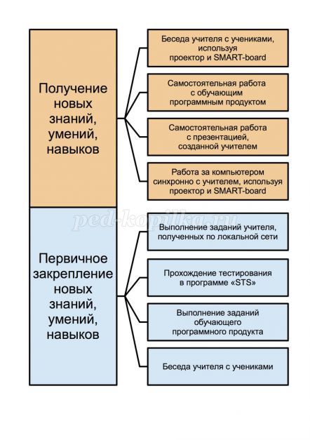 Це методика використовується мною при підготовці до уроків. Вона значно заощаджує час, оскільки всі можливі способи пояснення і перевірки ЗУН у мене перед очима на схемах «Конструктора уроків». Вибравши підходящий до конкретного уроку варіант з лівої частини Конструктора, я вибираю відповідний варіант з правої частини. Схема проведення уроку готова.