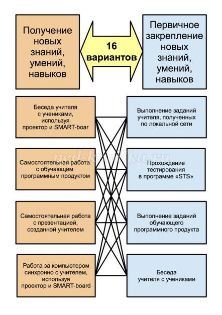 Таким чином, на цьому прикладі, виходить 16 варіантів уроків пояснення і первинного закріплення.
