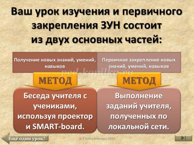 Методика економить час учителя, дає йому можливість збирати і накопичувати електронні тематичні колекції матеріалів до уроків, дозволяє вибирати найбільш підходящий для конкретного випадку варіант організації уроку і вносити потрібні корективи.