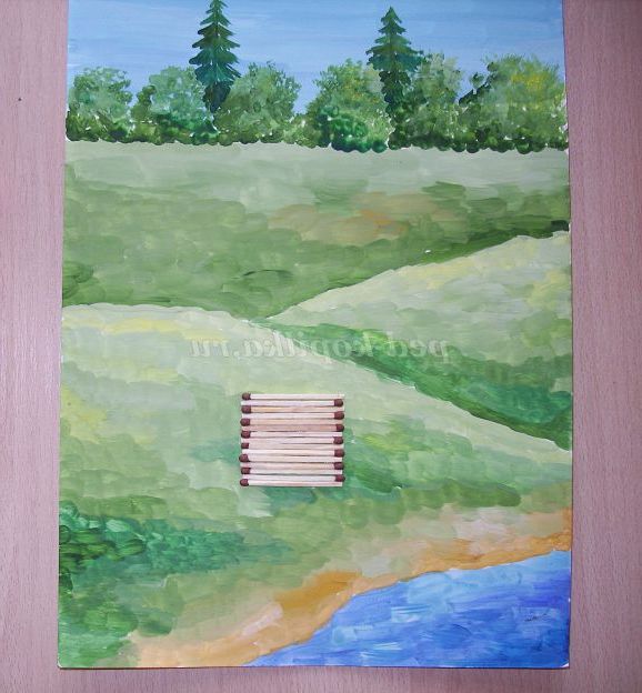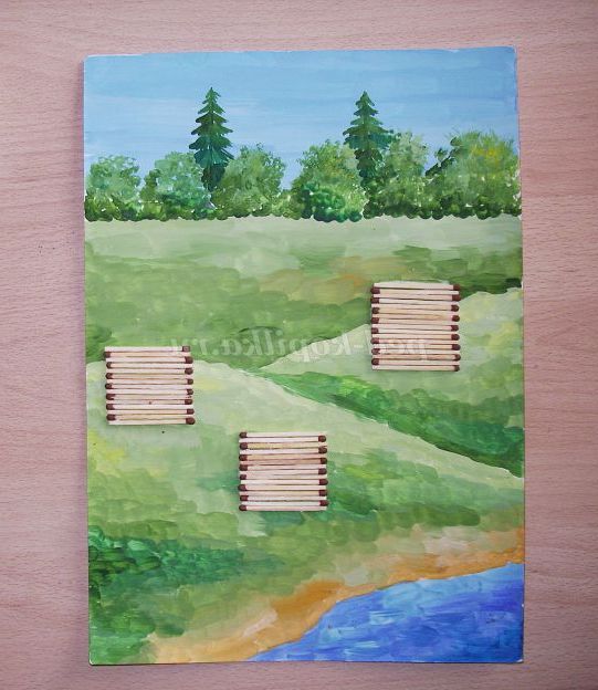 Викладаємо сірники "Колодязем", чергуючи сірчані головки по черзі. Після викладання, сірники підрівняйте і притисніть пальчиками до малюнка, потримайте кілька секунд.