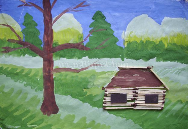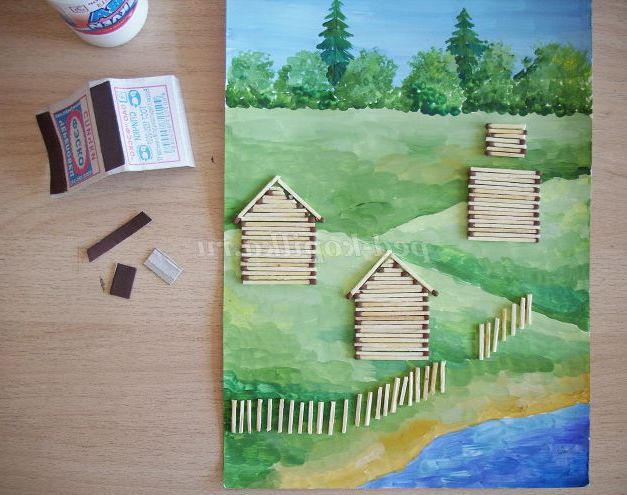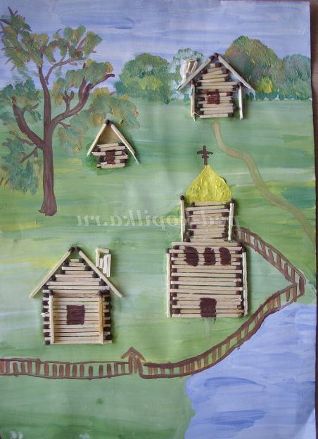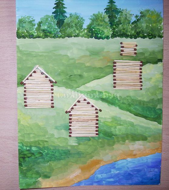 Фронтони хат викладаємо з обрізаних сірників. Дітям пропоную (на вибір) інший варіант: зафарбувати фронтони фарбою.