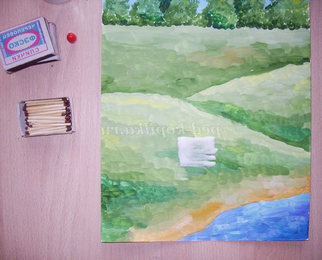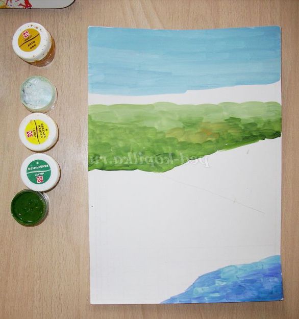 Додамо в кришечку з білою фарбою трохи зеленої, перемішаємо. Додамо в кришечку з жовтою фарбою трохи зеленой.перемешаем. Отриманими відтінками зеленого кольору починаємо розфарбовувати землю.