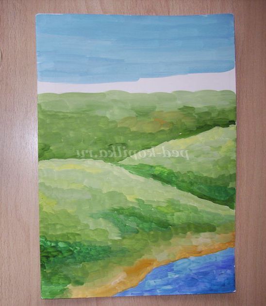 Також блакитним кольором малюємо річку, додаючи синіх відтінків.