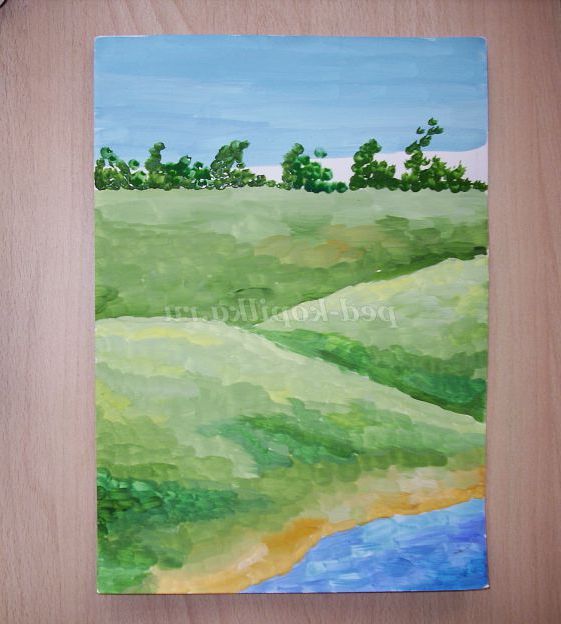 Обов'язково використовуємо переходи фарб: від темного до світлого. Листяні дерева можна виконати прийомом тычка.Хвойные дерева промальовуємо тонкою кистю.