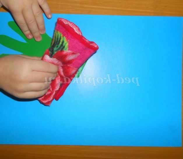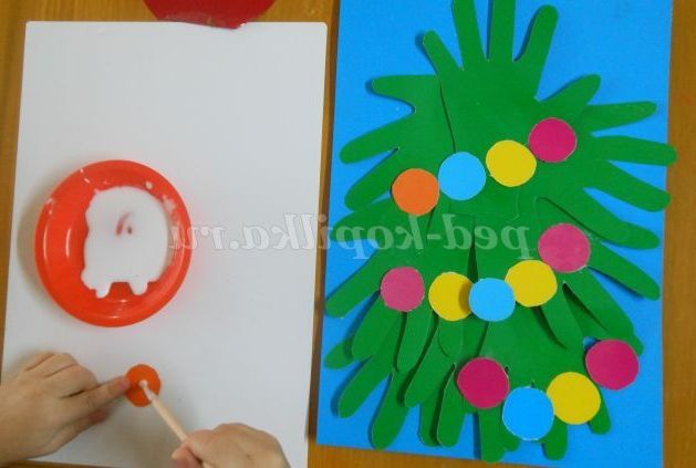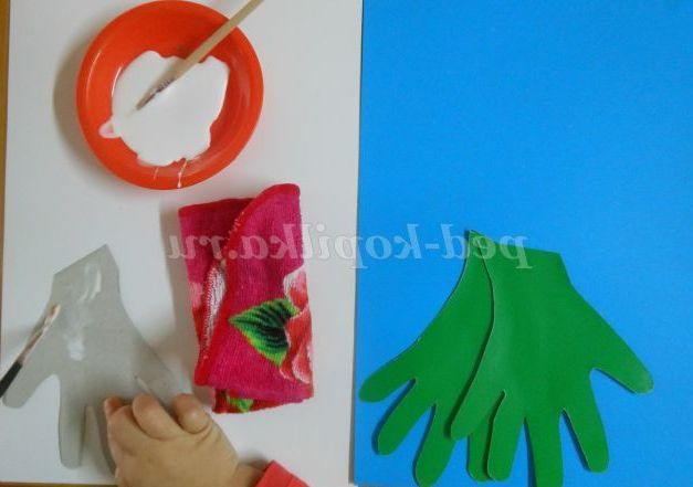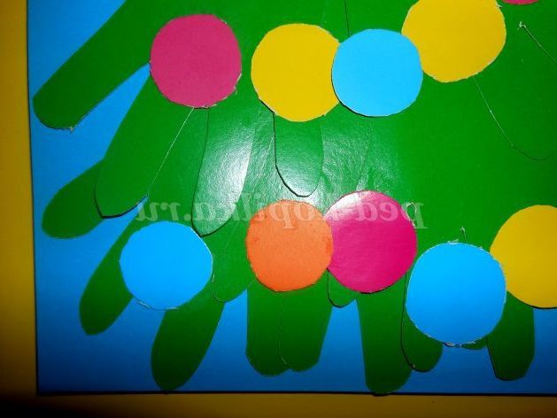 3. Пропонує дитині пофантазувати, згадують вірш про ялинці, дитина викладає долоньки. Потім кожну долоньку, намащує клеєм тільки верхню частину, що б ялинка вийшла пухнастою. Приклеюємо долоньку знизу вгору. Педагог нагадує, що кожну долоньку треба притискати серветкою.