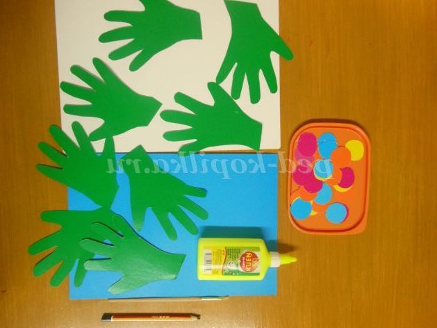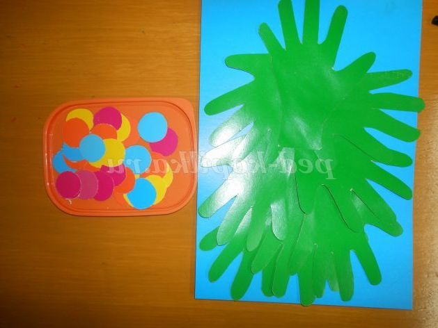 5. І так поступово дитина приклеює спочатку в низу 3 долоньки, потім 2, ще 2 і в завершенні маківку 1 долоньку