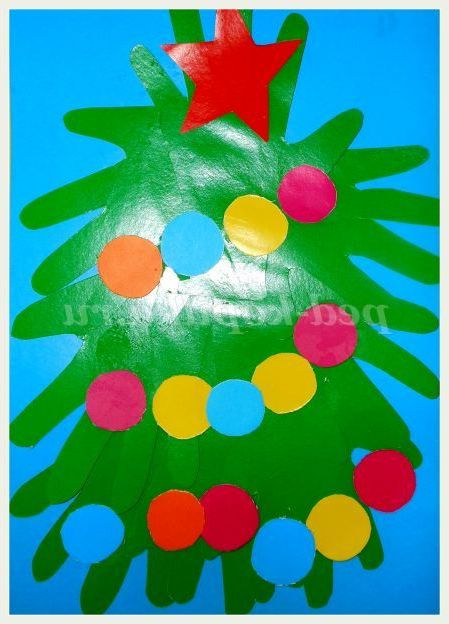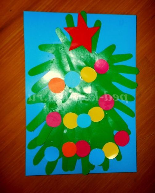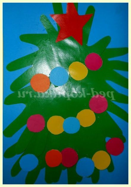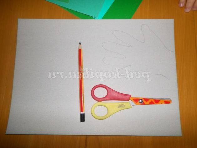 1. Для нашої роботи нам потрібен щільний кольоровий картон, їм краще всього працювати, клеїться він добре і не розмокає від клею. Основою нашої ялинки будуть долоньки. Педагог обводить ручку дитини.