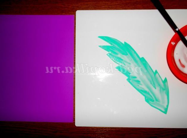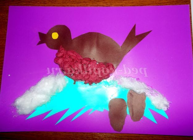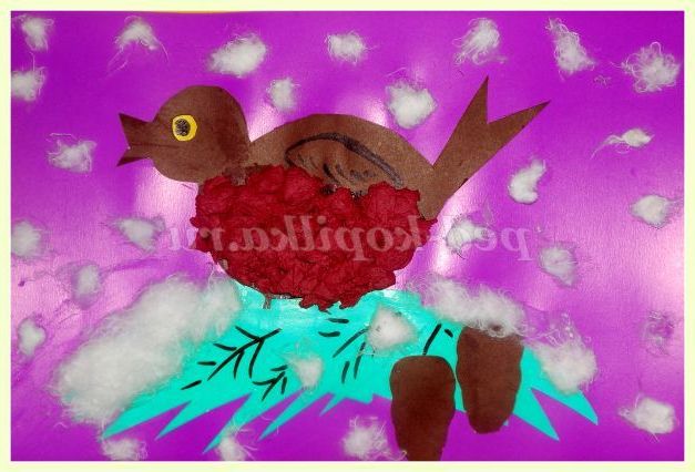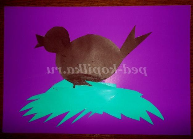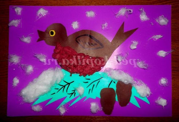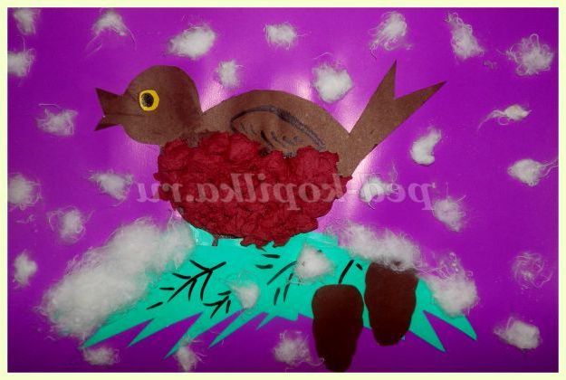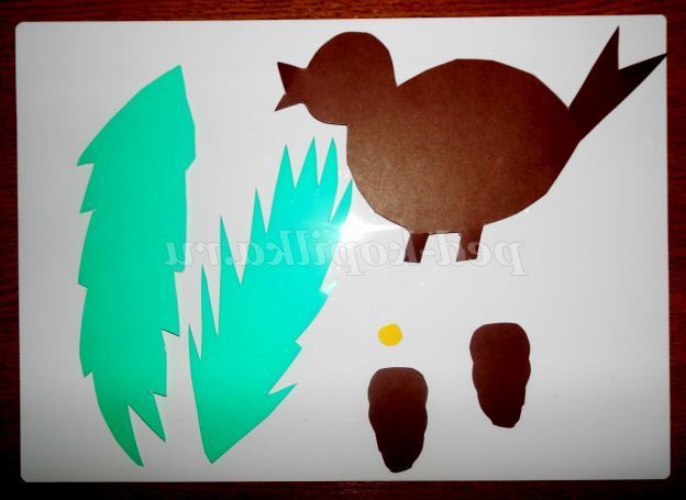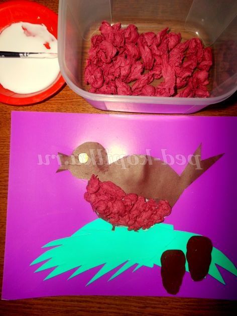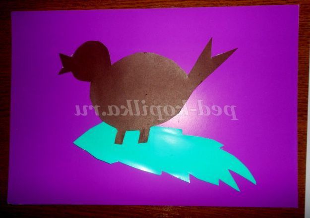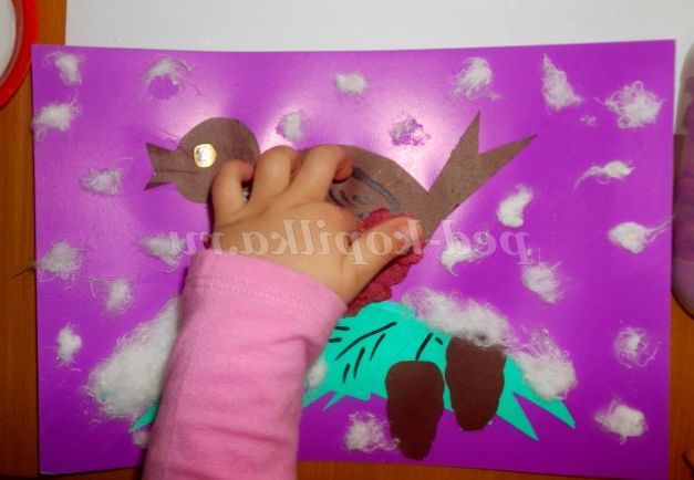 4.Теперь пташка, так само, дитина намазує по всій поверхні клеєм і акуратно прикладає птицю до гілочки. Педагог повинен стежити, що б дитина користувався серветкою і добре притискав деталі.