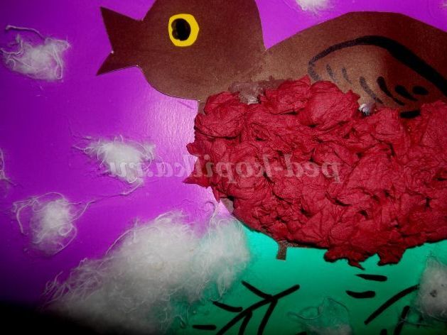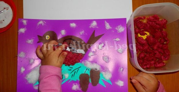 7.Ребенок починає викладати грудочки червоного кольору на грудці пташки, там, де педагог намазав клеєм
