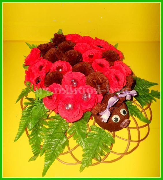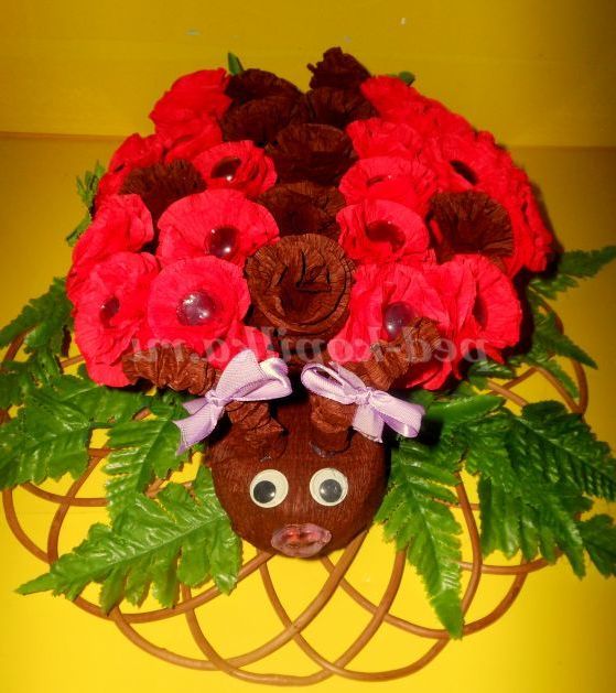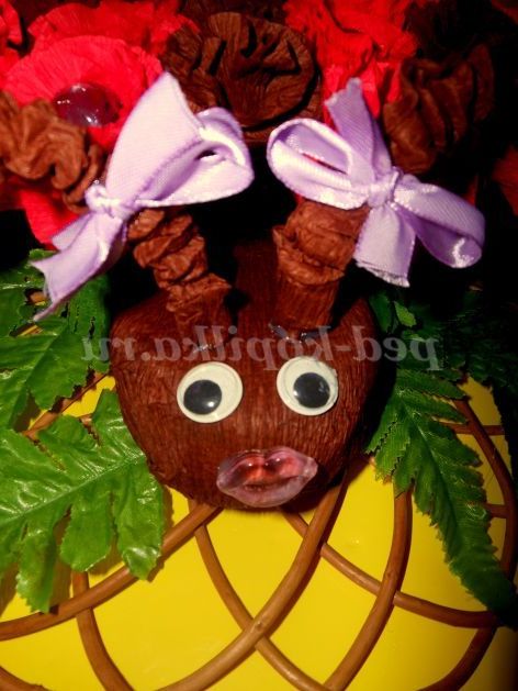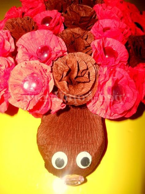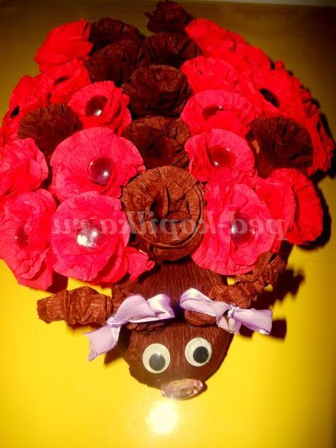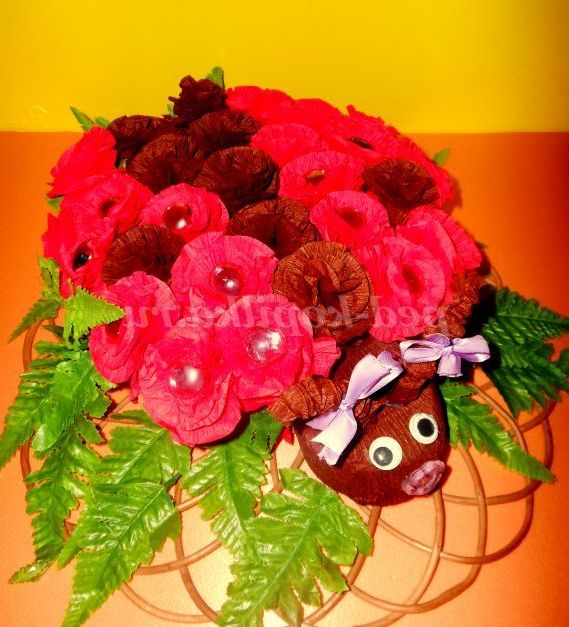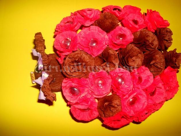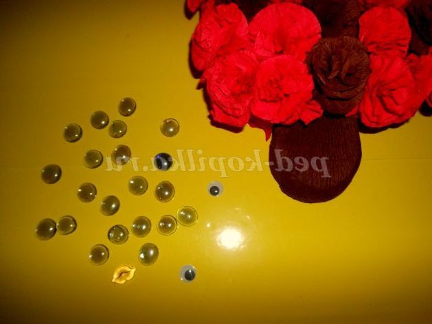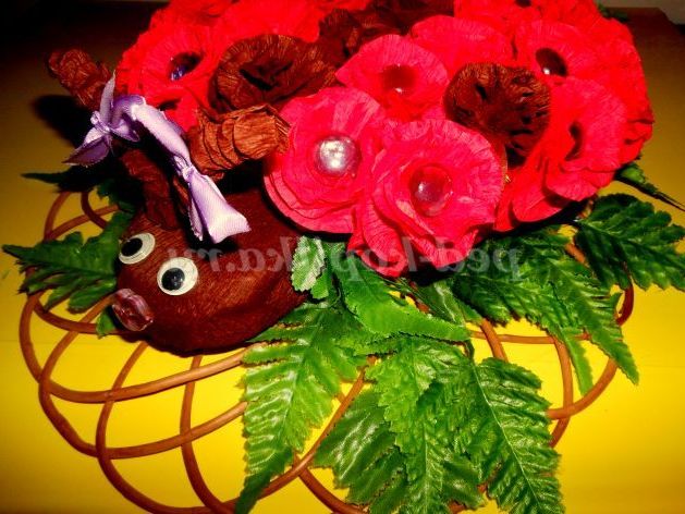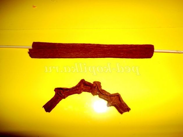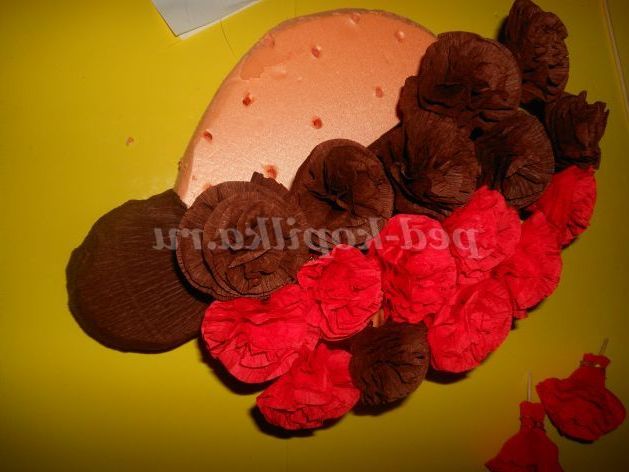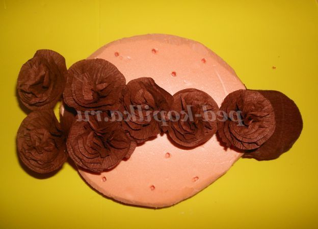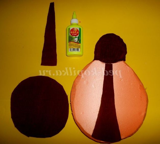 2.теперь готуємо коричневу папір, вирізаємо коло діаметром 8 см і місце для крилець трикутник 17 x 5,акуратно приклеюємо на спинці і обтягуємо голову коричневою папером і склеюємо за допомогою клею ПВА . Креповая папір дуже гнучка і добре тягнеться тому майже не залишається складок, навіть якщо і будуть, то не значні і видно їх не буде.