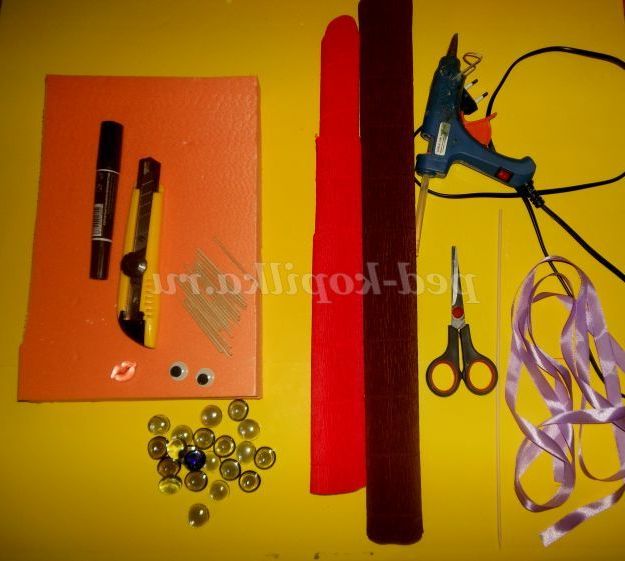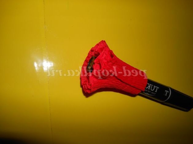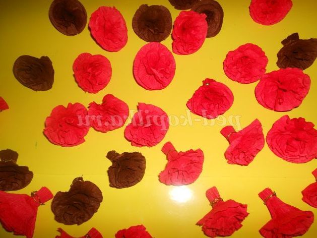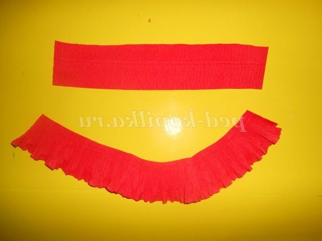 3. Беремо червону папір і нарізаємо смужки 35x5,край паперу фігурно розтягуємо подушечками пальчиків тим і хороша креповая папір, що виходить хвилястий і красивий край хвилеподібний