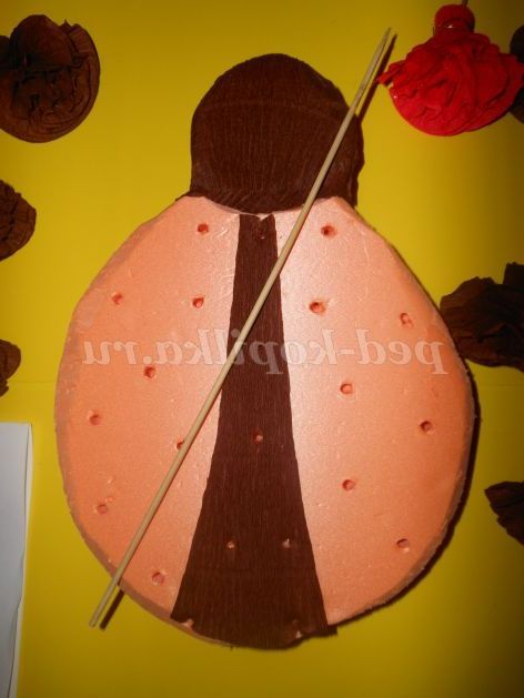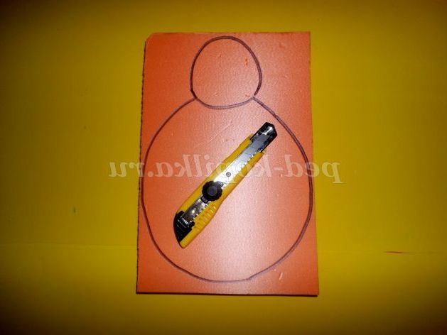 1.Берем шматок пеноплена 25 x 40, маркером малюємо образ божої корівки, можна використовувати трафарет. Потім беремо канцелярський ніж і вирізаємо, заокруглюючи боки.