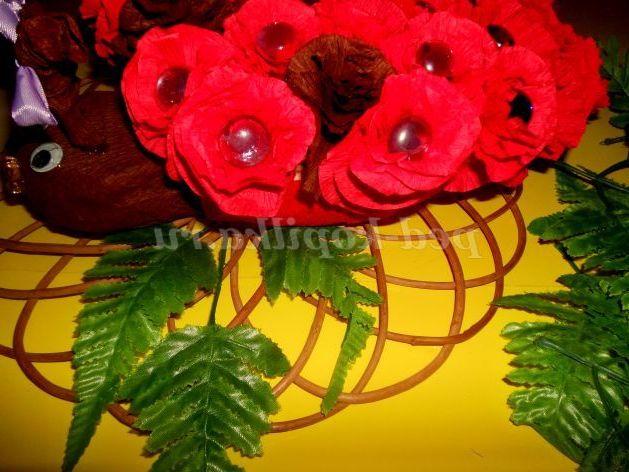 20.заключительная частину, ми оформляємо місце, де буде знаходитися наша божа корівка, беремо плетений коло і штучні листочки