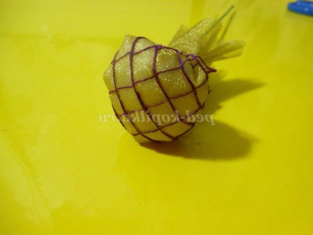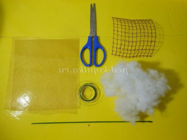 Вставляємо дріт в основу синтепону прокручуємо, формуємо кульку обмотуємо органзою і закріплюємо дротом