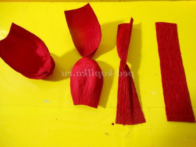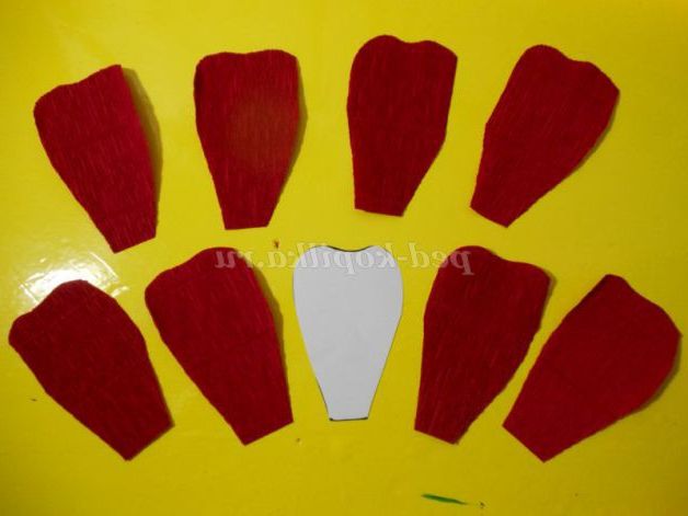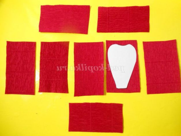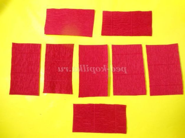 Для цього відрізаємо смужку креповой паперу червоного кольору довжиною 21 см і шириною 11 див. Цю смугу паперу потрібно скласти в три рази і тепер можна вирізати одночасно три пелюстки для маку, для однієї квітки я буду використовувати 8 пелюсток