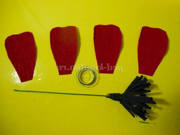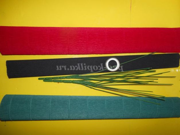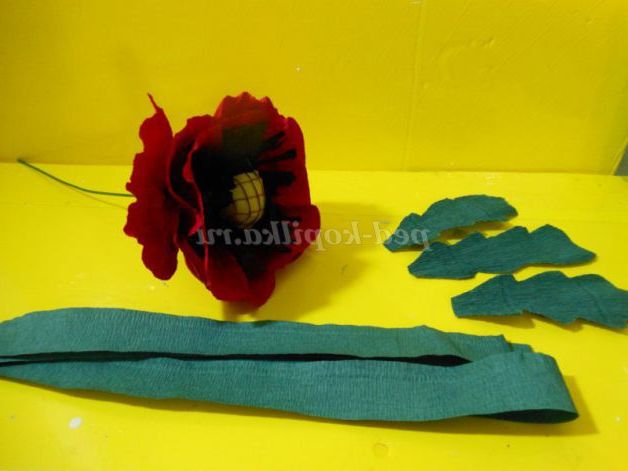 Крок сьомий: формуємо квітка маку на стеблинці з листям для цього потрібно нарізати смужок по довжині рулону завширшки 1,5см, добре розтягнути зафіксувати на плодоніжці терма клеєм і обернути, далі кожен листок приматывать до стеблинки, а можна і обмотати тейп стрічкою