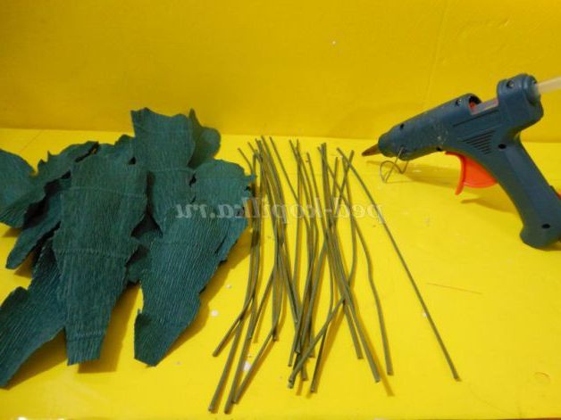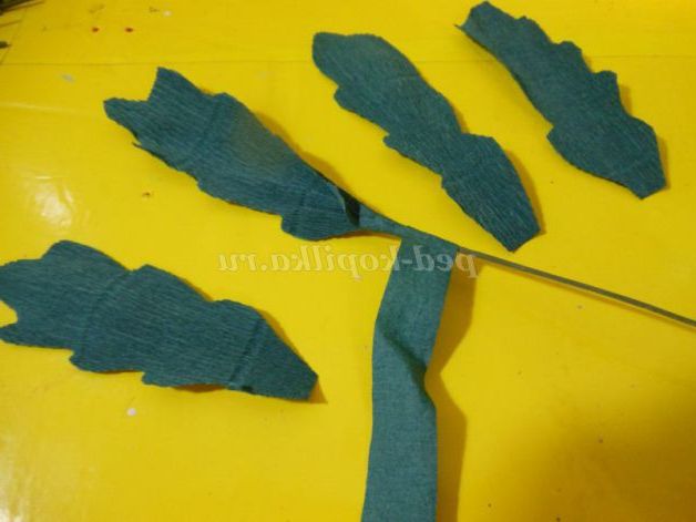 І робимо просто зелень, за таким же принципом, кріпимо верхній листочок на терма клей, а кожен листок примотуємо відрізаною смужкою