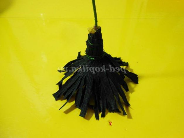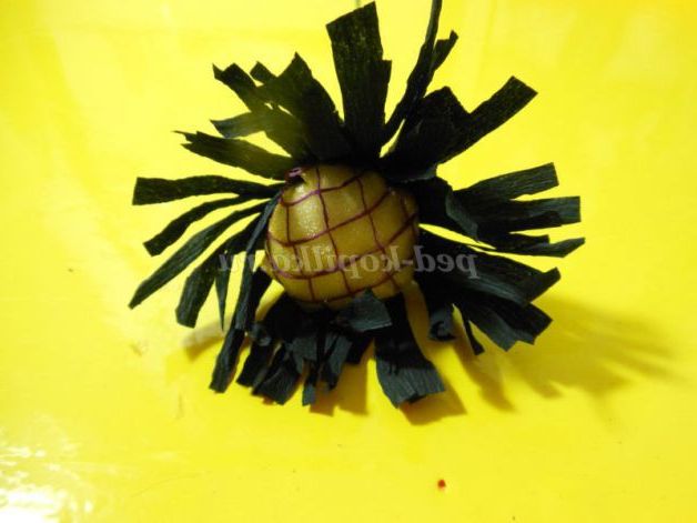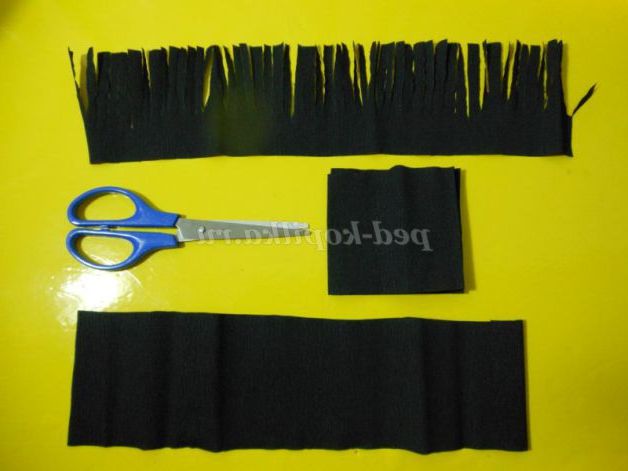 Беремо гофрований папір чорного кольору, відрізаємо смужку 7х30, складаємо у кілька шарів і нарізаємо смужками не доходячи до протилежного краю.