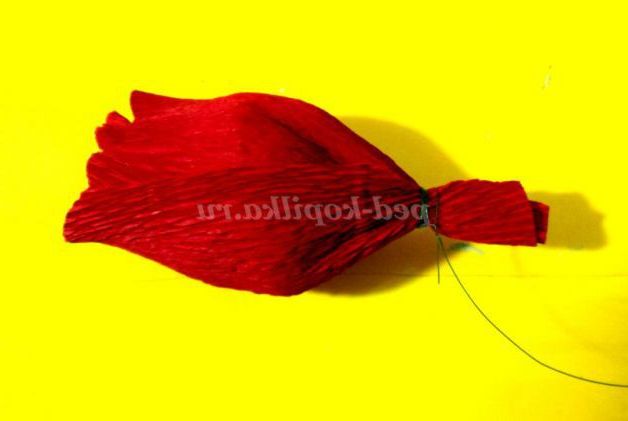 Тепер всі чотири пелюстки червоного кольору формуємо в бутон і фіксуємо дротом