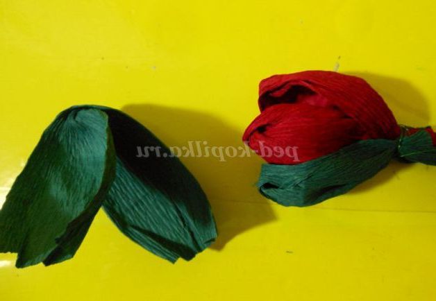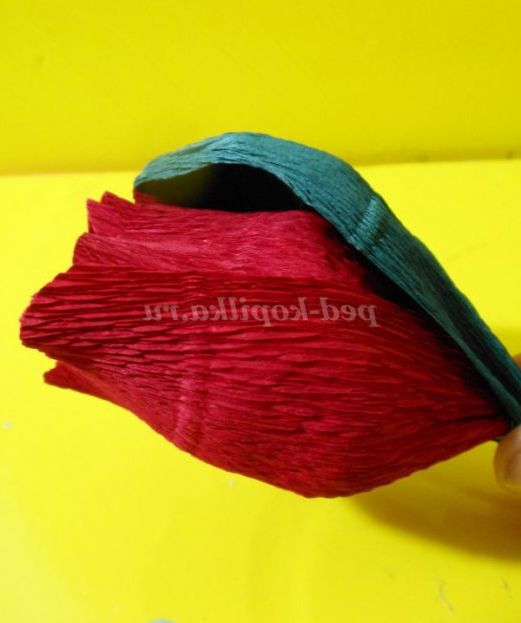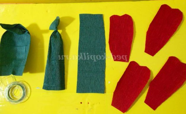 Нам знадобиться три прямокутника зеленого кольору 5х12 і червоного кольору 7х4.Вырезаем пелюстка вгорі заокруглюючи, а зелений прямокутник беремо в руки зверху 3см відраховуємо і перекручуємо, кінчик загинаємо всередину і вигинаємо зсередини, на фото це добре видно