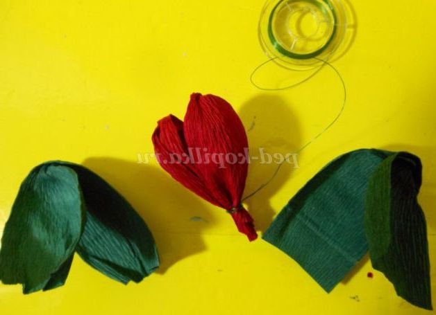 Потім примотуємо зелені пелюстки і також кріпимо дротом