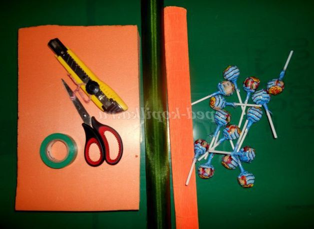 В даний час як ніколи цінують подарунки, зроблені своїми руками, які зберігають індивідуальність, частинку душі і тепло рук рукодільниці! Пропоную зробити Вам кошик троянд з цукерками в кожній квіточці. Цукерки в даному випадку Чупа - чупси легко дістаються (выдавливаясь), квіточки не пошкоджуються. Красивий букет буде довго радувати вас і близьких вам людей. У мене онук зібрався на день народження до дівчинки, а вона просто обожнює Чупа - чупси, ось він і купив їй цілу упаковку, ми з ним подумали і вирішили, що ми подаруємо їй цю упаковку з нашому подарунком трояндочки з Чупа - чупсами всередині, звичайно з усіма робити не будемо їх там 100 штук, а зробимо сім трояндочок в кошику