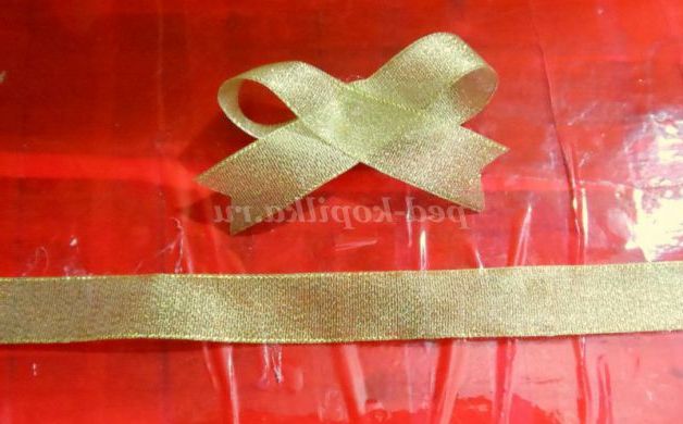 З золотистої стрічки нарізаємо смужки 25см і з допомогою стіплера робимо бантики