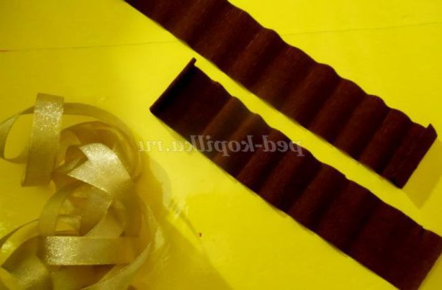 Тепер з креповой папери коричневого кольору нарізаємо смужки по довжині ручки і довжині кошики, і робимо хвилеподібний в низ на кошик з одного боку, а на ручку з двох сторін